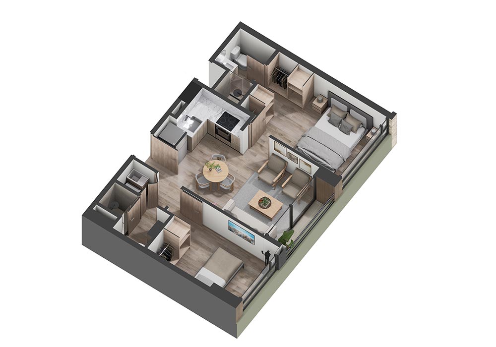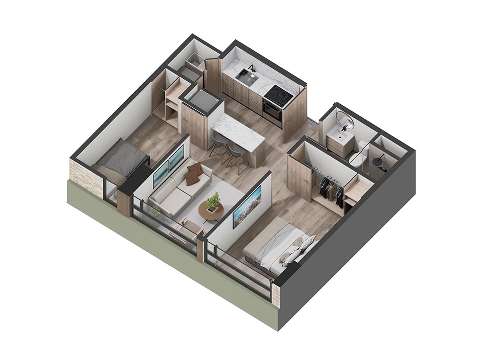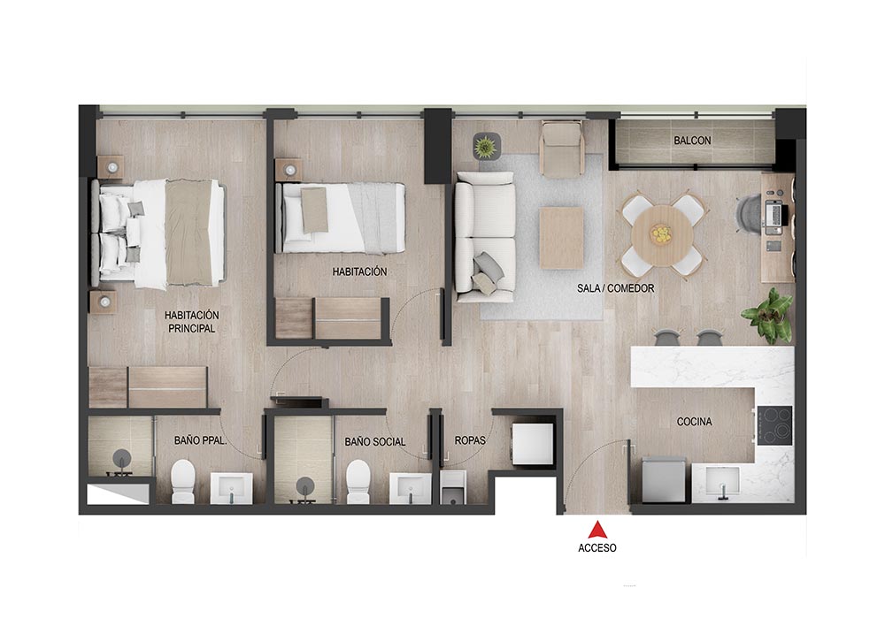 2 Alcobas | 2 Baños completos | Sala + comedor | Espacio de Estudio | Cocina Abierta | Zona de Ropas | Balcón