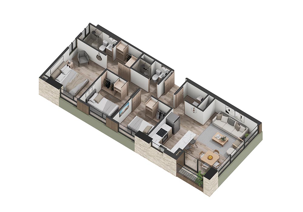 3 Alcobas | Walking Closet en la alcoba principal | 2 Baños completos | Sala + comedor | Cocina Abierta | Zona de Ropas | Balcón